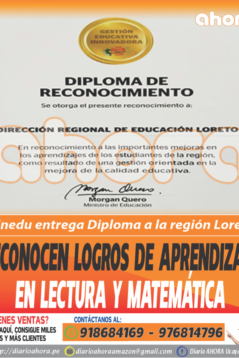 Leer másMinedu entrega Diploma a la región Loreto RECONOCEN LOGROS DE APRENDIZAJE EN LECTURA Y MATEMÁTICA El ministerio de Educación encabezó