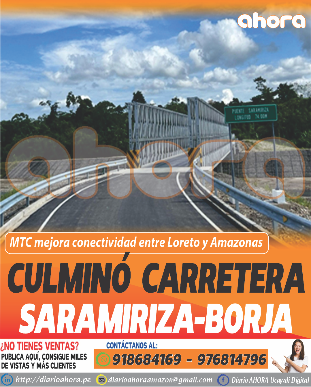 Loreto, mar. 5.El Ministerio de Transportes y Comunicaciones (MTC) continúa fortaleciendo la infraestructura vial en la Amazonía con la culminación de la carretera Saramiriza-Borja, en la provincia de Datem del Marañón, departamento de Loreto. Esta obra permitirá mejorar la conectividad y el tránsito en beneficio de más de 15,000 habitantes de la región, informó el ministro Raúl Pérez Reyes.