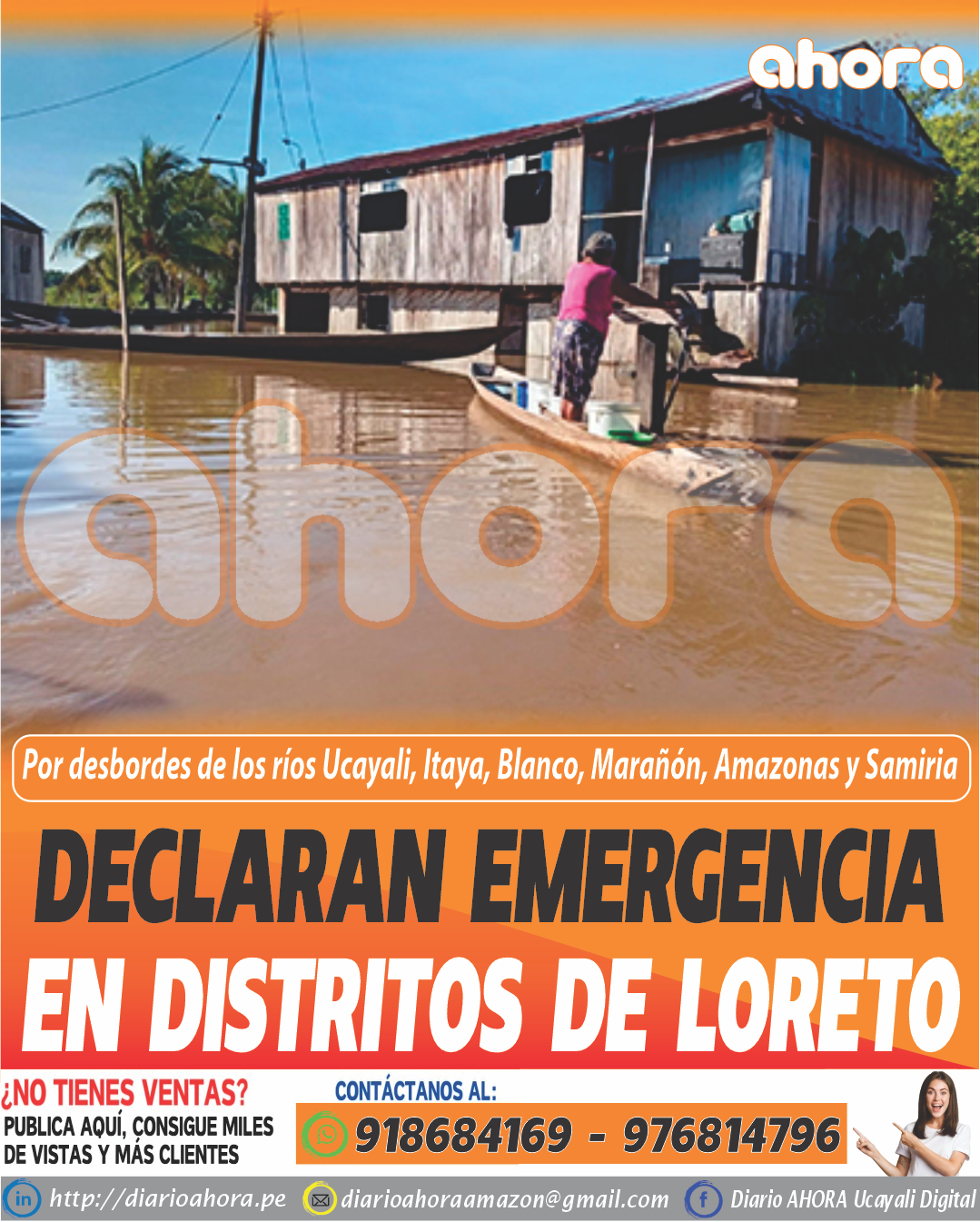 Lima, may. 1.El Gobierno declaró el estado de emergencia en varios distritos de algunas provincias del departamento de Loreto, por impacto de daños a consecuencia de intensas precipitaciones pluviales.