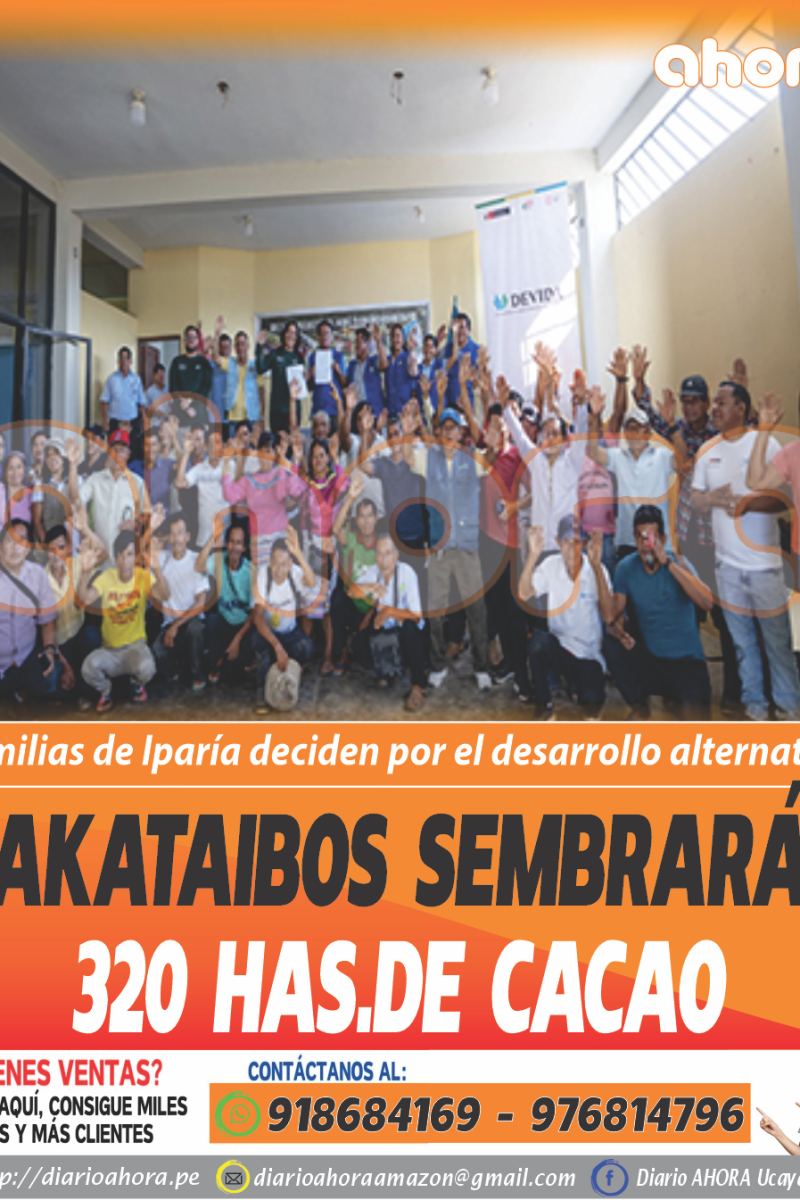 Devida y la Municipalidad Distrital de Iparía suscribieron un acta de entendimiento que beneficiará directamente a más de 250 familias de 10 comunidades nativas del distrito, mediante la intervención de 320 hectáreas de cultivo de cacao en las etapas de instalación, crecimiento y producción, en el distrito de Iparía, ubicado en la provincia de Coronel Portillo (Ucayali).