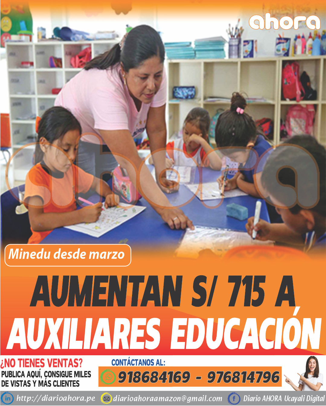 Lima, mar. 2.El Poder Ejecutivo aprobó un aumento salarial de S/ 715 desde este mes de marzo para los auxiliares de educación nombrados y contratados en las instituciones educativas públicas, a fin de generar mejores condiciones para el inicio del año escolar 2025.