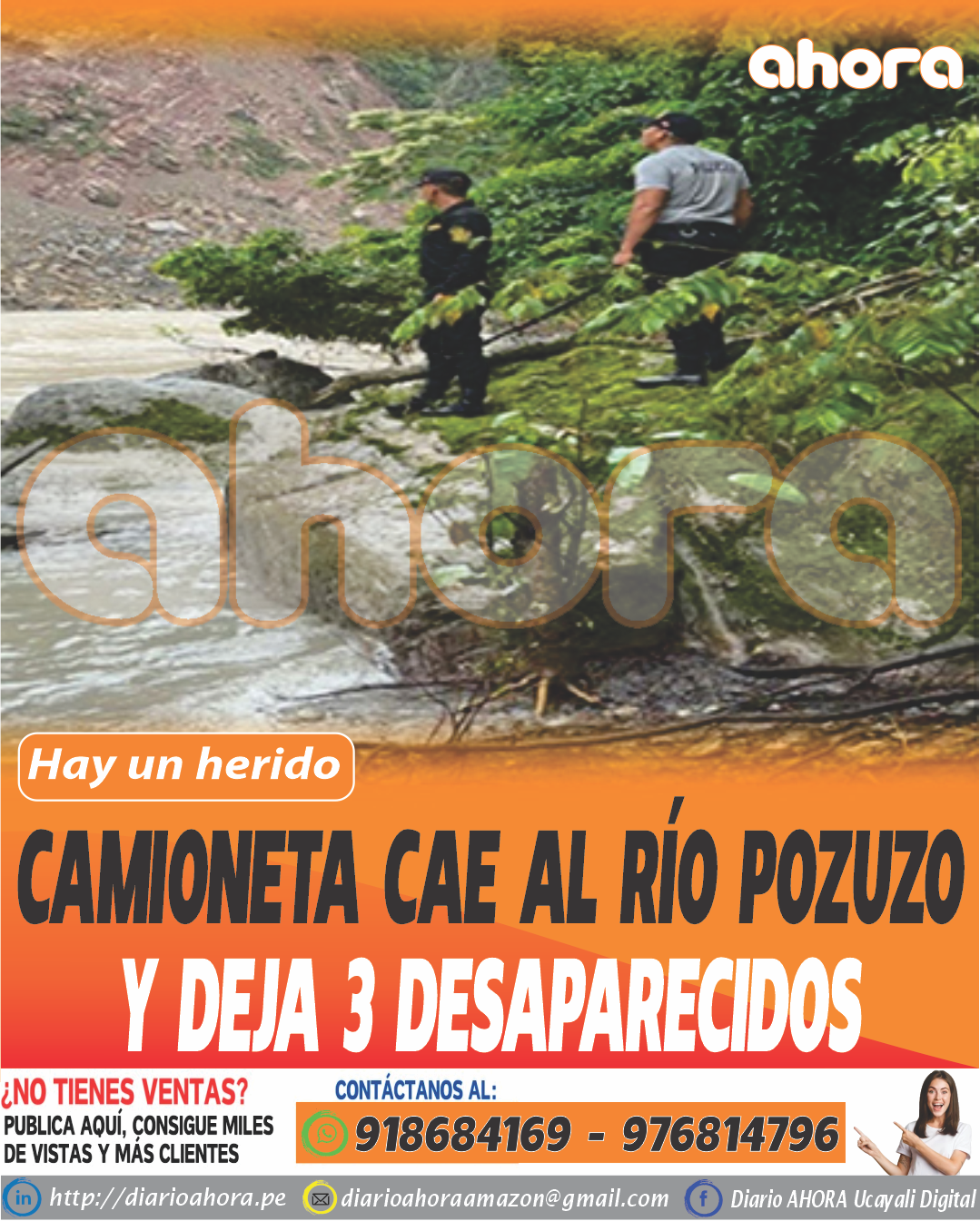 Pasco, mar. 16.En la madrugada del sábado 15 de marzo, una camioneta se precipitó al río Pozuzo, en el sector Casa Blanca, carretera a Codo del Pozuzo. El vehículo, que transportaba a cuatro ocupantes, sufrió una volcadura, dejando a uno de ellos herido y a tres desaparecidos.