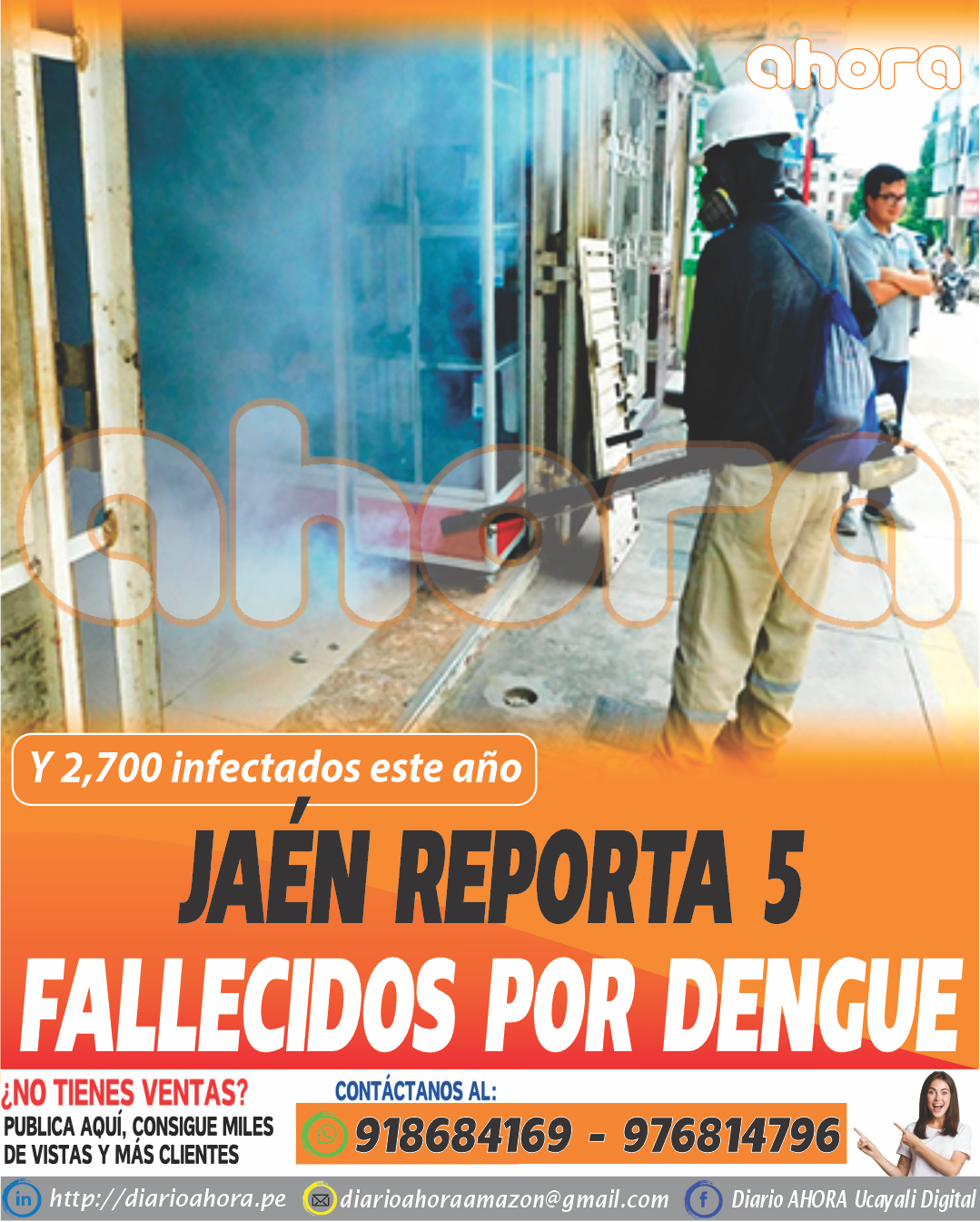 Cajamarca, abr. 25.El dengue alcanzó el pico más alto de infectados en la provincia cajamarquina de Jaén, con 2,700 casos en lo que va del año y cinco personas adultas fallecidas, informó la Dirección Regional de Salud (Diresa) de Cajamarca.