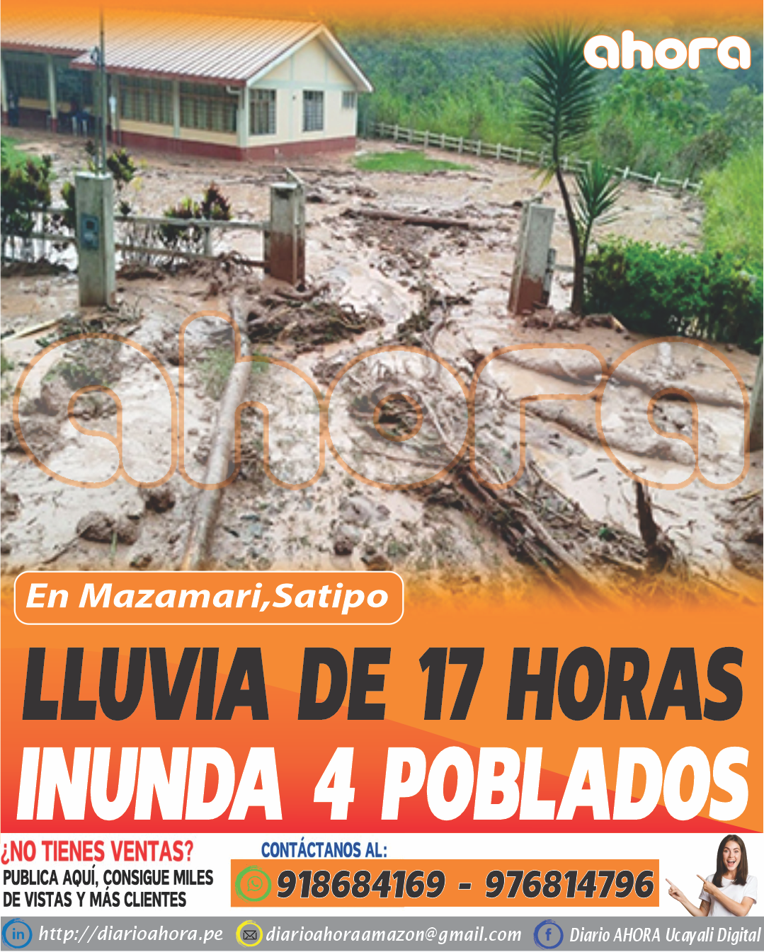 Satipo, mar. 1.Al menos cuatro centros poblados y comunidades nativas de la provincia de Satipo, región Junín, resultaron inundadas tras una lluvia torrencial de más de 17 horas que se registró en esa zona de la Selva Central del país. La fuerte precipitación pluvial provocó la activación de quebrada y desborde de ríos afectando a los pobladores.