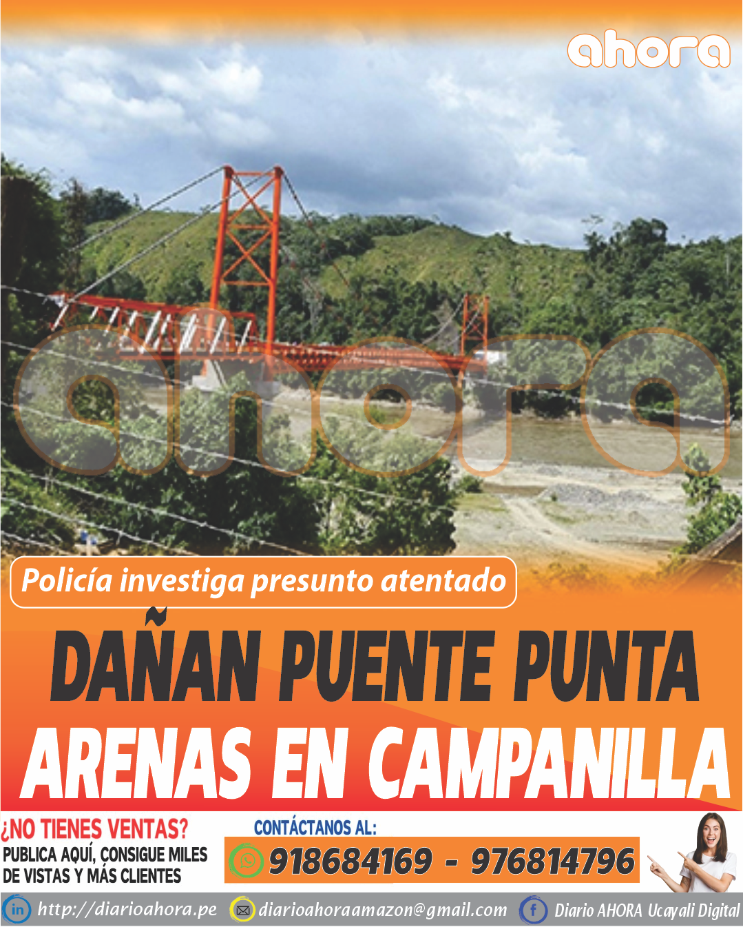 Lima, mar. 13.La Policía Nacional del Perú (PNP) investiga un presunto atentado contra el puente Punta Arenas ubicado en el distrito de Campanilla, provincia de Mariscal Cáceres, región San Martín. Dicho puente, que cruza el río Huallaga, evidencia un corte en uno de los cables que sostiene dicha infraestructura.