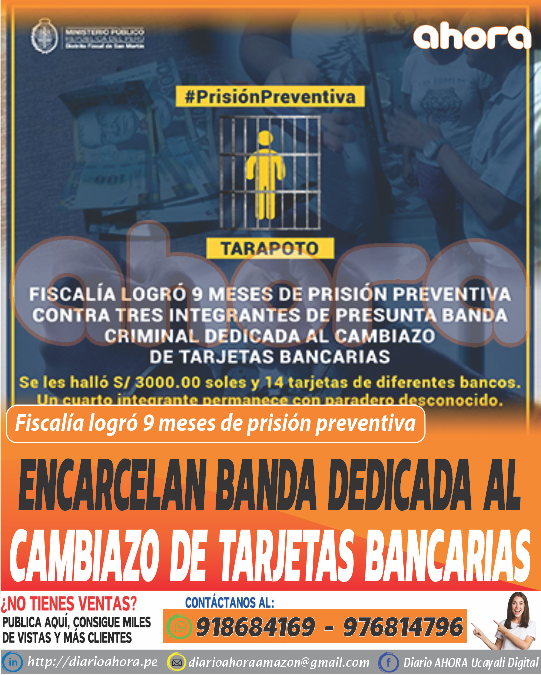 Tres de los cuatro investigados fueron intervenidos y detenidos por las autoridades policiales, hallándose en su poder la suma de S/ 3000.00 soles, 14 tarjetas bancarias y otras pertenencias; en tanto, el cuarto imputado José Alberto Risco Ahuanari, aún permanece con paradero desconocido, tras huir del hospedaje donde todos se encontraban reunidos, al percatarse de la presencia policial.