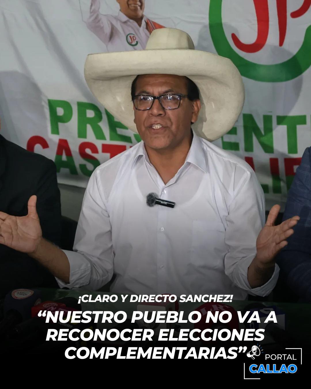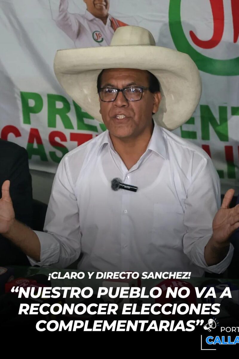 “Todo nuestro pueblo no va a reconocer esas elecciones complementarias porque no son constitucionales, no tienen ninguna razón jurídica ni legal. Por eso, desde aquí, Bambamarca, Cajamarca, con la voz de nuestro hermano presidente Pedro Castillo, con nuestro pueblo, responsabilizamos al Juzgado Nacional de Elecciones. Ellos serán los responsables de esta crisis, porque acá el voto de Cajamarca se respeta”, sostuvo. Durante su intervención, Sánchez aseguró que su agrupación insistirá en la liberación del expresidente Pedro Castillo. El candidato también dijo que ningún proyecto minero avanzará sin consulta previa. En esa línea, fue enfático al referirse al proyecto Conga, al afirmar que “no va”.