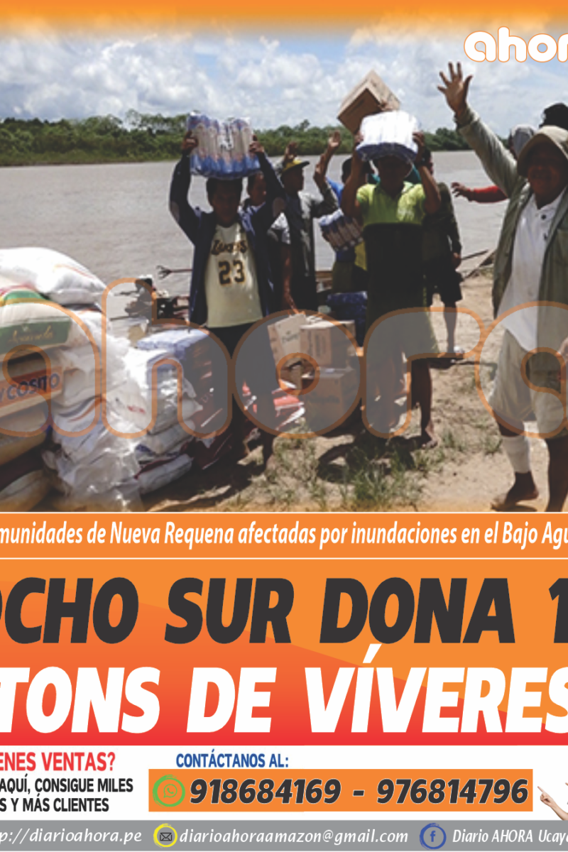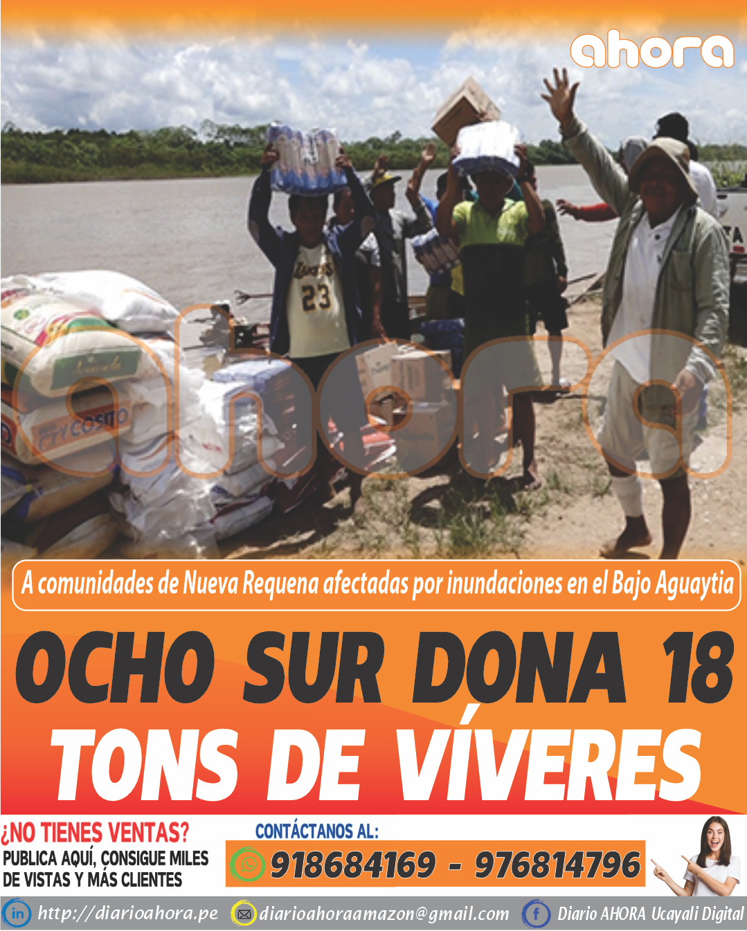 Ocho Sur, una vez más, dando muestras de sus lazos de amistad y buena vecindad con las poblaciones, colaboró con la entrega de víveres como arroz, fideos, avena, fariña, pollos vivos, papa canchan, cebolla, tomate, zanahoria, aceite, azúcar, sal, harina, ajos, frejol, leche, entre otros alimentos más, de acuerdo a su población y tiempo de encontrarse inundadas por el rio.