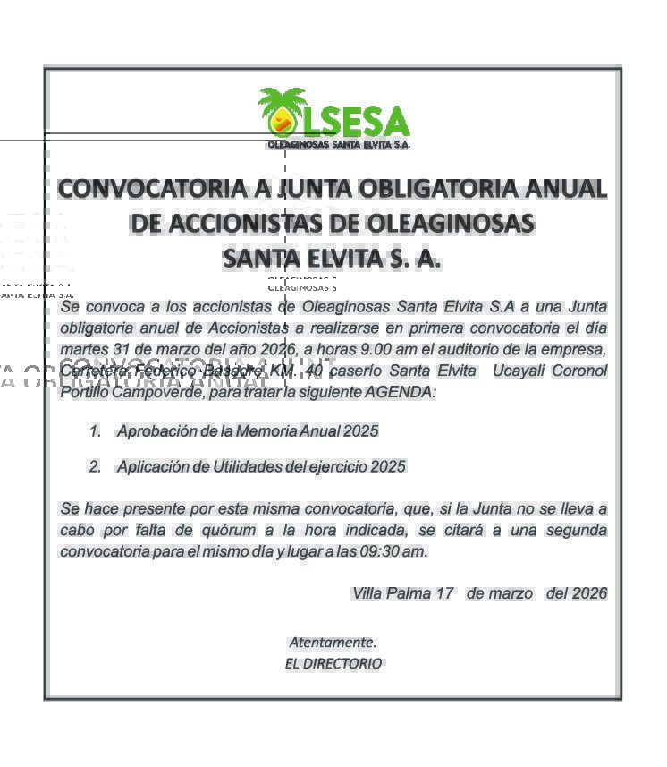 Perú PUCALLPA UCAYALI CONVOCATORIA A JUNTA OBLIGATORIA ANUAL DE ACCIONISTAS DE OLEAGINOSAS SANTA ELVITA S.A marzo 18, 2026 admin 0 comentarios