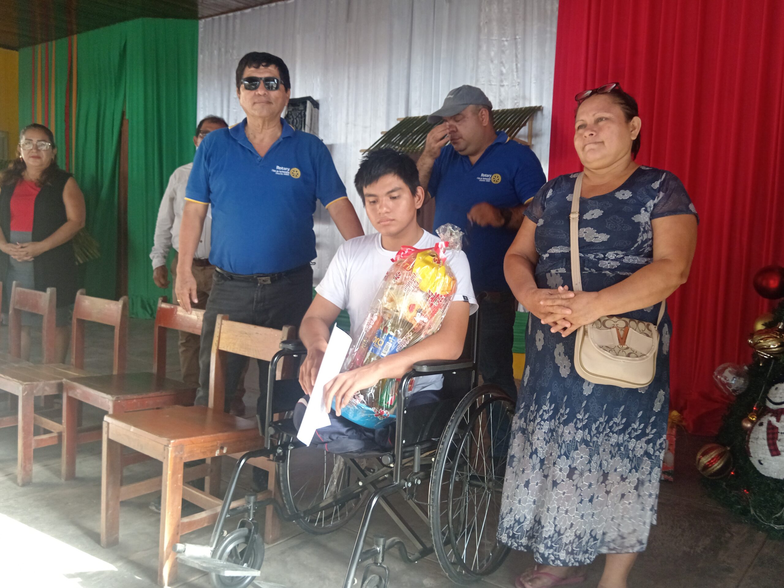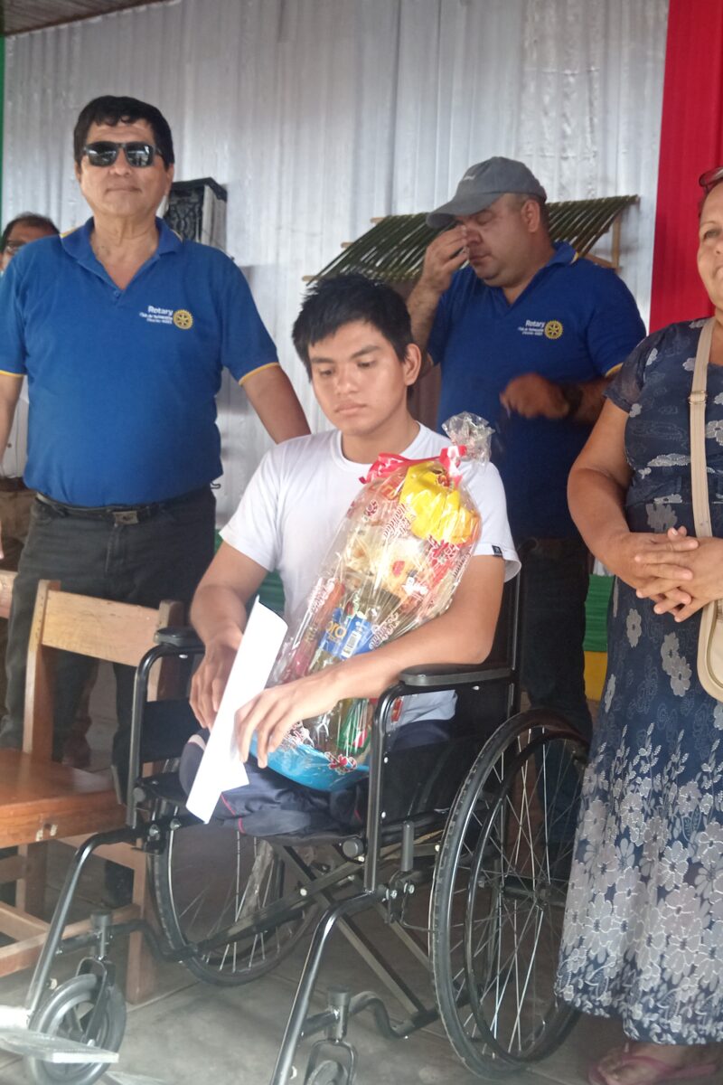 El presidente del Rotary Club de Yarinacocha, Jesús Baldeón, junto a su junta directiva, hizo entrega de una silla de ruedas a un joven deportista con habilidades especiales de la institución educativa Los Libertadores de América, quien ha logrado importantes resultados en competencias nacionales, dejando en alto el nombre de la región Ucayali.